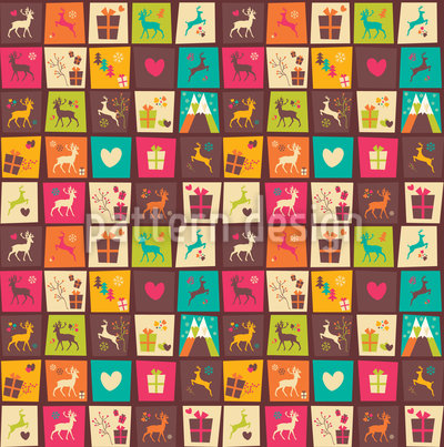 Design with Christmas trees, reindeer, gift boxes and snowflakes.