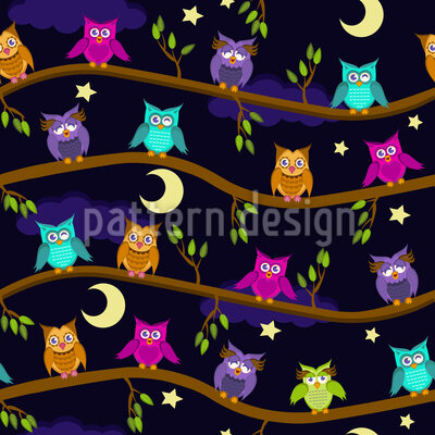 Busy night! Extremely cute owls are sitting at night on branches in wave optics.