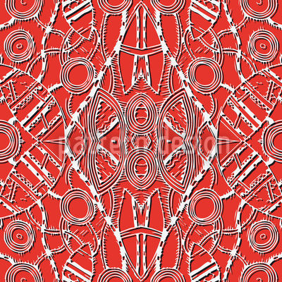 Feines Ethno-Design mit abstrakter Linienzeichnung und spielerischen Elementen auf rotem Hintergrund.