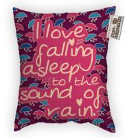 "I love falling asleep to the sound of rain." Das perefkte Kissen für regnerische Nächte. Der Text wirkt wie appliziert auf das 30cm breite und 40cm hohe Kissen gedruckt.
