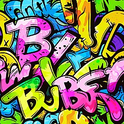 Urbanes Stoffdesign mit ausdrucksstarken Graffiti-Lettern, dynamischen Formen und kraftvoller Farbwirkung. Ideal für moderne Projekte mit Statement-Charakter.
