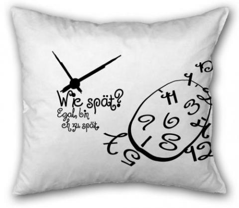 "Wie spät?" "Egal, bin eh zu spät." Der Stoff ist für eine ca. 40x30cm große Kissenfront gedacht. Als 60x40cm Stück-Stoff reicht dann der verbleibende Teil für die weiße Rückseite vom Kissen.
